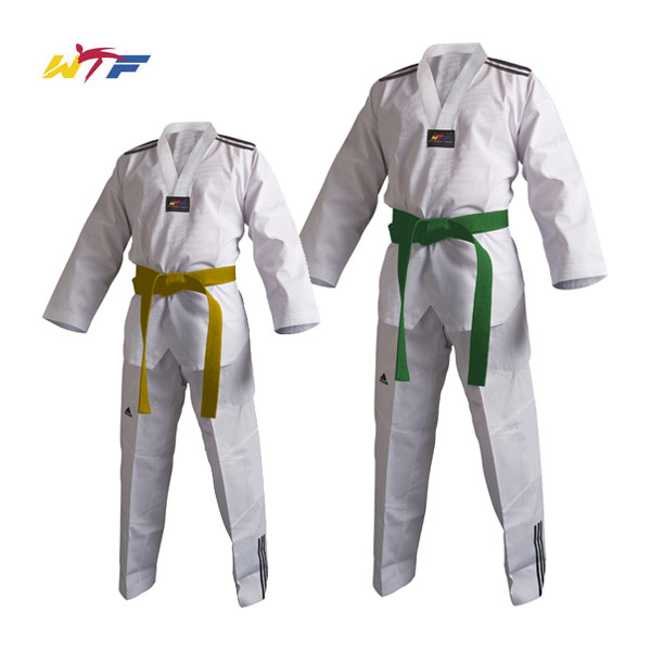 adidas dječji Club /// taekwondo dobok. Osvježenje iz adidas taekwondo programa. Vrhunski dizajn s tri crte. Rebrasti materijal u kombinaciji poliestera i pamuka. Odobrenje svjetske taekwondo federacije WTF za sva natjecanja i trening. Pojas nije uključen u cijenu.